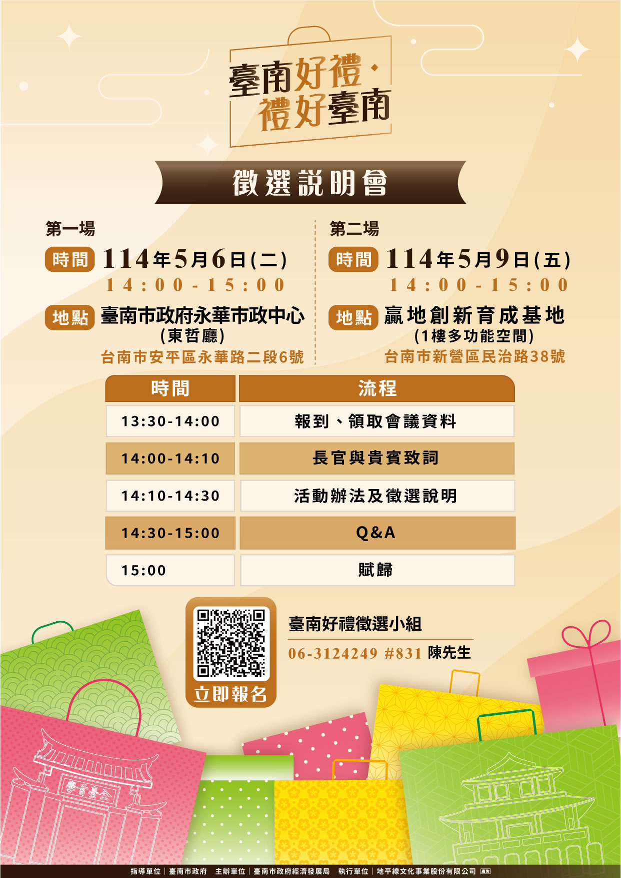 本次徵選主題分為「好禮」、「好鮮」及「好物」三大主題,為使業者更了解徵選活動,特別舉辦兩場徵選說明會。活動資訊如下: