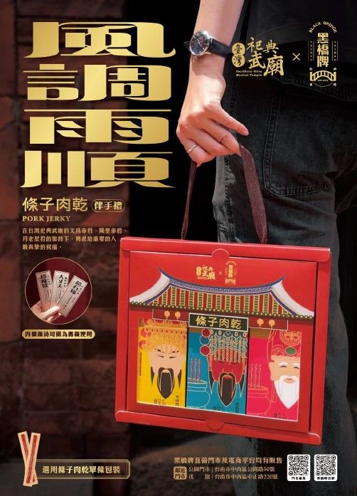 肉品專家「黑橋牌」與全臺唯一官方祀典關帝廟「台灣祀典武廟」雙聯手,推出「大丈夫」、「超有緣」、「穩條欸」三款聯名條子肉乾,黑橋牌以三種不同風味的條子肉乾,分別呼應祀典武廟中「關聖帝君」、「月老星君」、「文昌帝君」三尊神明的特色。商品包裝設計也具有小巧思,將三款包裝翻至背面併排,即可組成被譽為「全台最美廟宇山牆」的祀典武廟朱紅色東側山牆,展現台灣廟宇的建築美學。為了能夠讓大家更方便將心意傳遞給重要的人,黑橋牌以武廟的建築風格設計一款「風調雨順伴手禮盒」,將三款條子肉乾裝在盒中,塑造三尊神明在廟宇裡的意象;打開禮盒後會發現紙墊上有三款籤詩,可沿虛線剪下作為書籤使用,讓送禮兼具誠意與創意