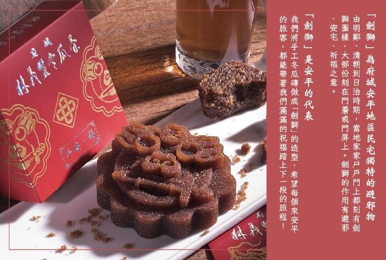 「劍獅」是安平的代表,我們耗時獨家研發出「劍獅」造型的冬瓜磚,將百年冬瓜磚,結合安平守護神,讓每個來安平的旅客,帶著我們滿滿祝福的深厚寓意,踏上下一段旅程!