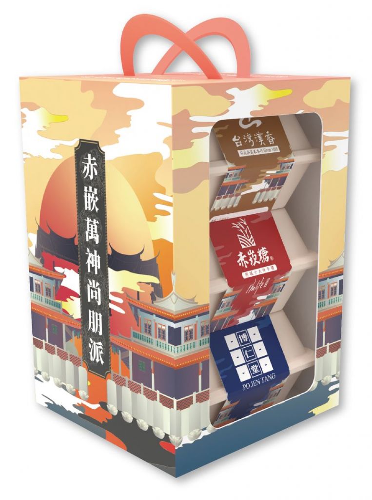 【赤嵌朋派】養生朋派包是由山川設計整合府城歷史之窗(台灣府城吳萬春香行)、博仁堂、赤崁糖原糖概念館以上三家臺南在地老店的明星商品,並以赤嵌萬神尚朋派的概念設計出伴手禮盒裝,希望能以店家串聯的概念,凝聚商圈店家的力量,讓更多人可以了解臺南赤嵌的生活與文化,也將商圈的特色商品透過一個禮包帶著走,自用送禮兩相宜。