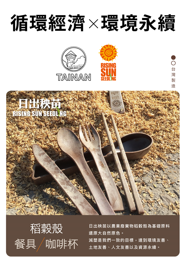 每年,大量的免洗餐具流入臺灣的土地與海洋,不僅破壞自然生態,還對人類健康構成潛在威脅。為了解決這一環境問題,以臺南東山地區農業廢料稻穀殼,開發出兼具環保與美學的餐具。這些餐具以稻穀纖維熱壓技術製成,每個產品的紋路都獨一無二,展現自然的獨特之美,且全程於臺灣製造,完美體現在地創新。