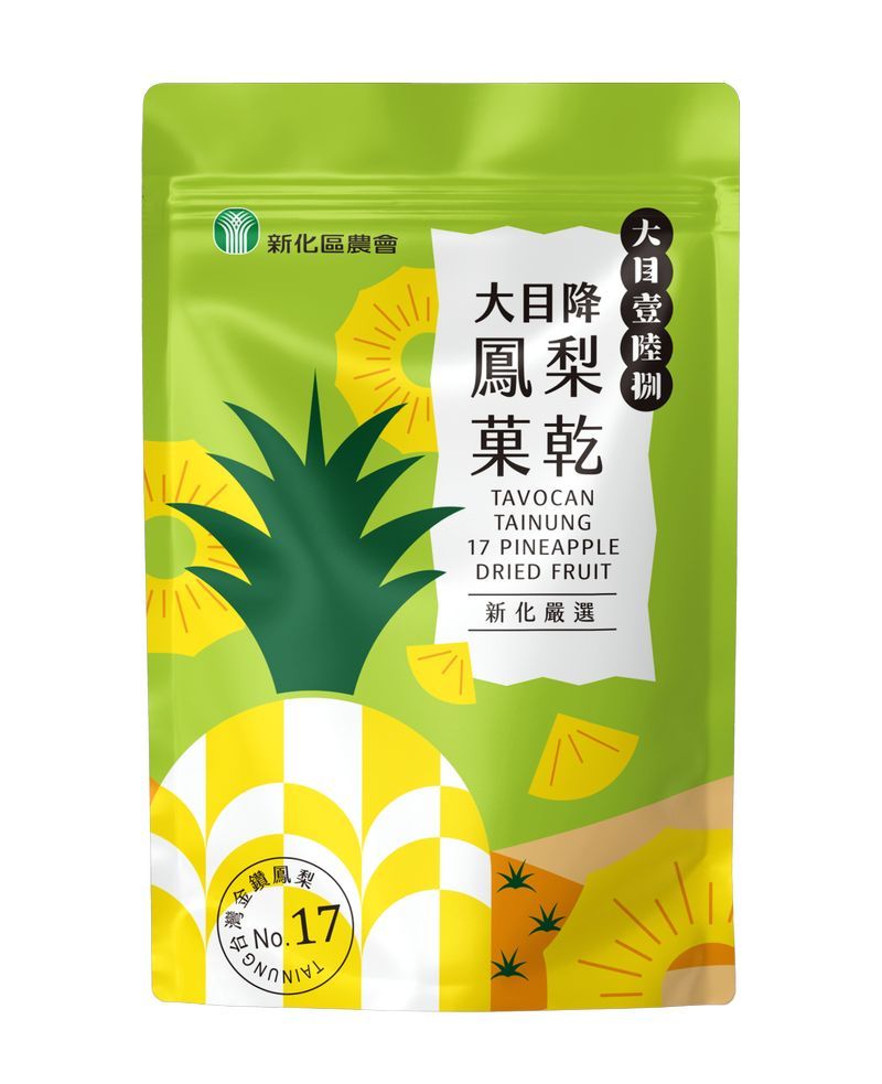 新化農會大目降鳳梨菓乾是嚴選17號金鑽鳳梨為原料,採低溫烘焙技術,製程嚴謹,絕無添加防腐劑、漂白劑、色素、甘味劑、香料等人工添加物,完整保留水果自然風味,口感柔嫩香Q,入口即感受酸甜的鳳梨濃郁果香,一口接一口,享受美味、幸福無負擔。